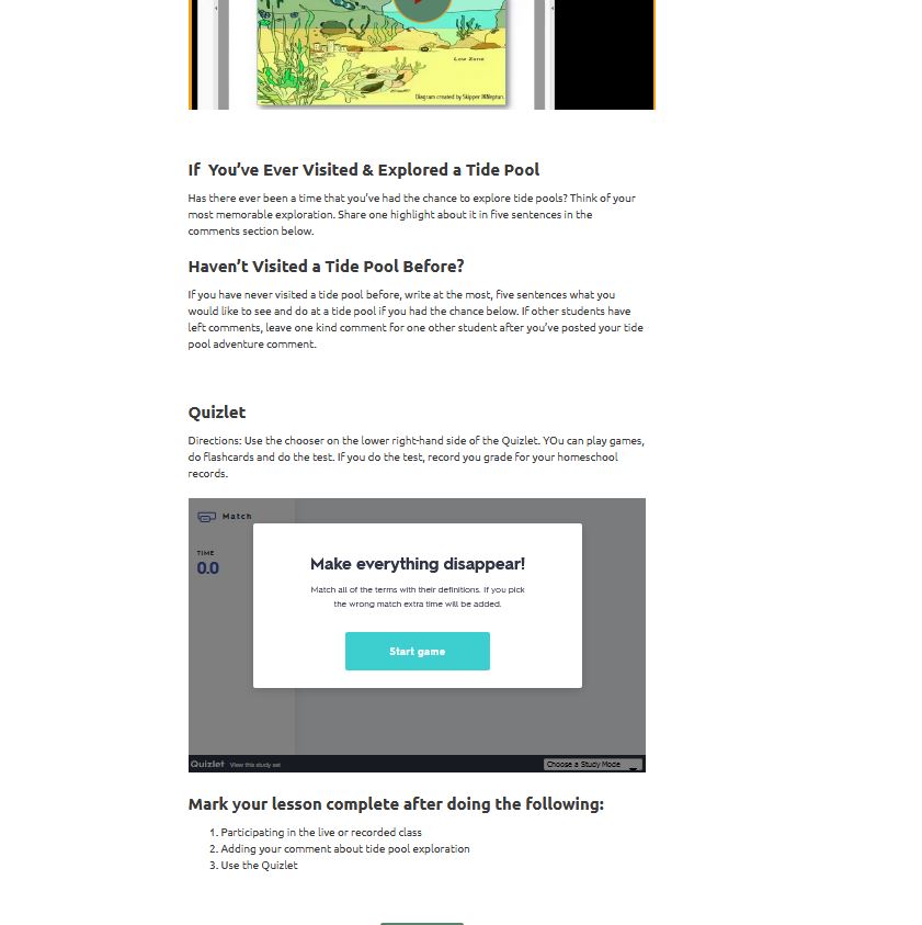 As we looked at the variety of courses offered, I allowed my children to choose which courses they wanted to try. We did three different courses (as well as looking at parts of some others) during our time reviewing this program. The three programs we focused on were the Tide Pool Communities, Bubbleology, and Exploring he Giant Redwood Trees. We look forward to continuing to use some of the other programs this year as time allows.