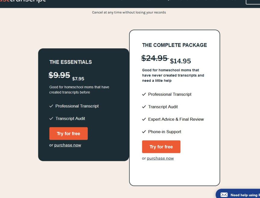Fast Transcripts is a subscription based program that has two different options. The first plan is $7.95 per month and allows you to put all your information into the system and get a professional transcript and their transcript audit process. They also have a complete package for $14.95 a month which includes the transcript and audit with the added benefit of expert advice, a final review, and phone-in support.