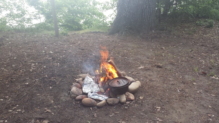 When we have the time, my favorite camping meal is chicken fajitas cooked over the fire. We put chicken breasts on a grate on the fire, onions and peppers in foil on the fire, and bring along all of our favorite toppings.