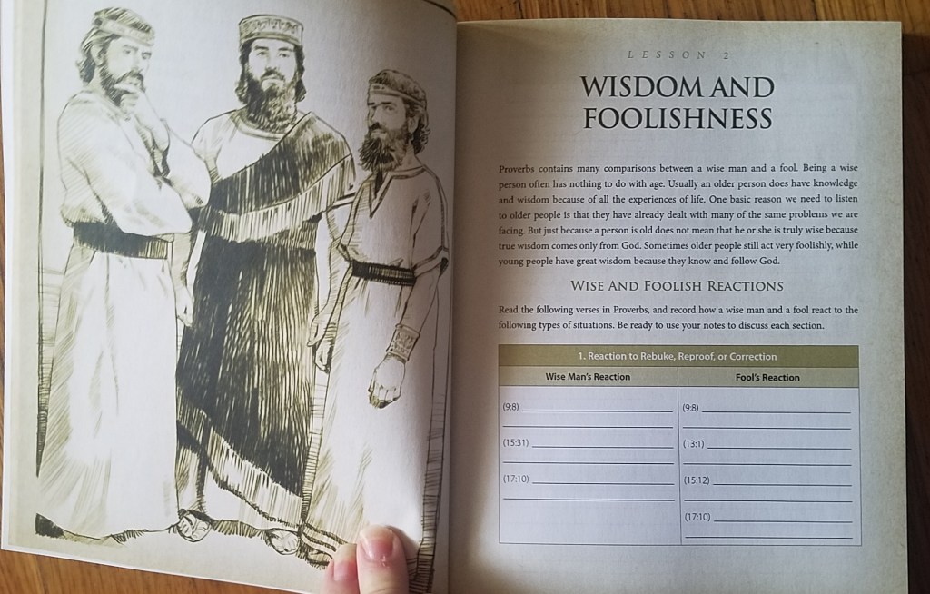 The teacher’s manual provided me with everything I needed to know to teach the lesson. Each lesson has target truths that they want the student to learn. For example, in lesson three one of the target truths was “A wise person knows how to handle conflicts.”