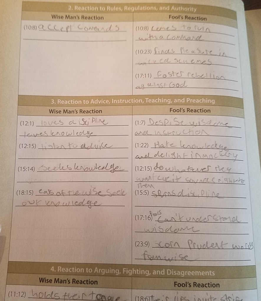 The student exercises had the students digging into different Bible passages and answering questions, completing charts, and filling in blanks. While much of it comes directly from the scripture, there were also questions that allowed them to reflect on those principles in their own life.