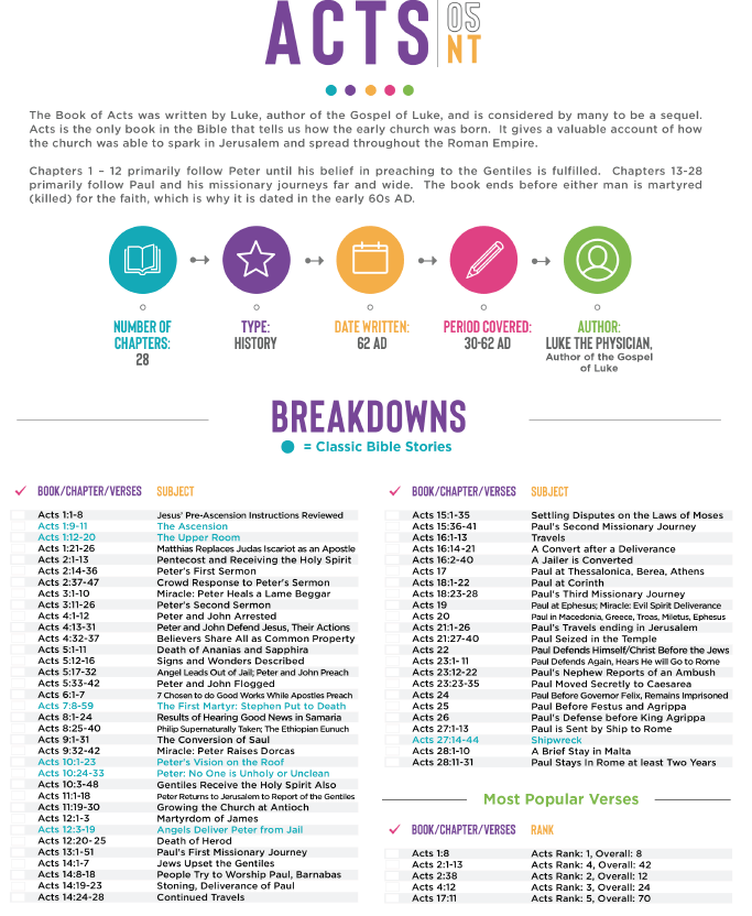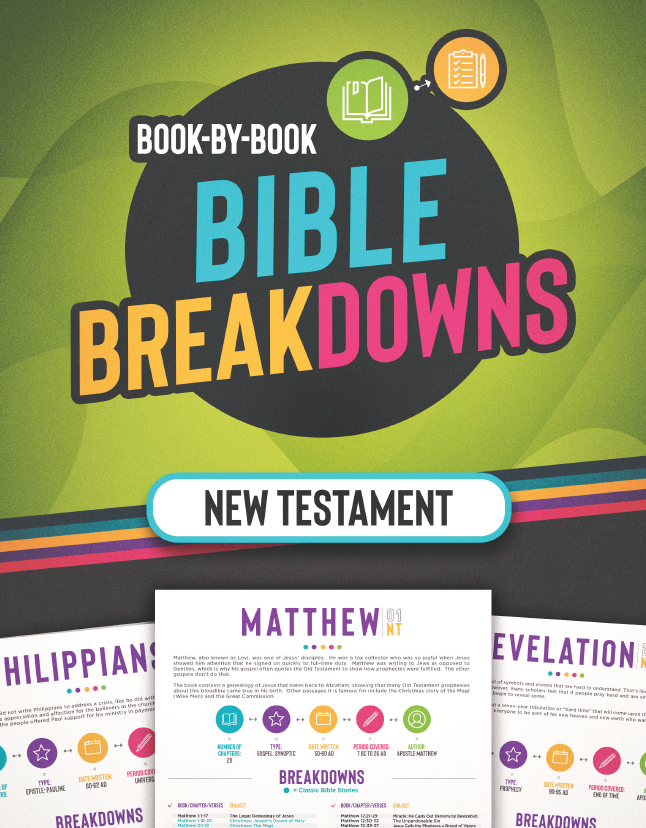 Almost all of the books of the Bible are broken down into one-page informational sheets (Matthew takes two pages). Each one includes information about each book: the number of chapters, type of book, date written, period covered, and the author.