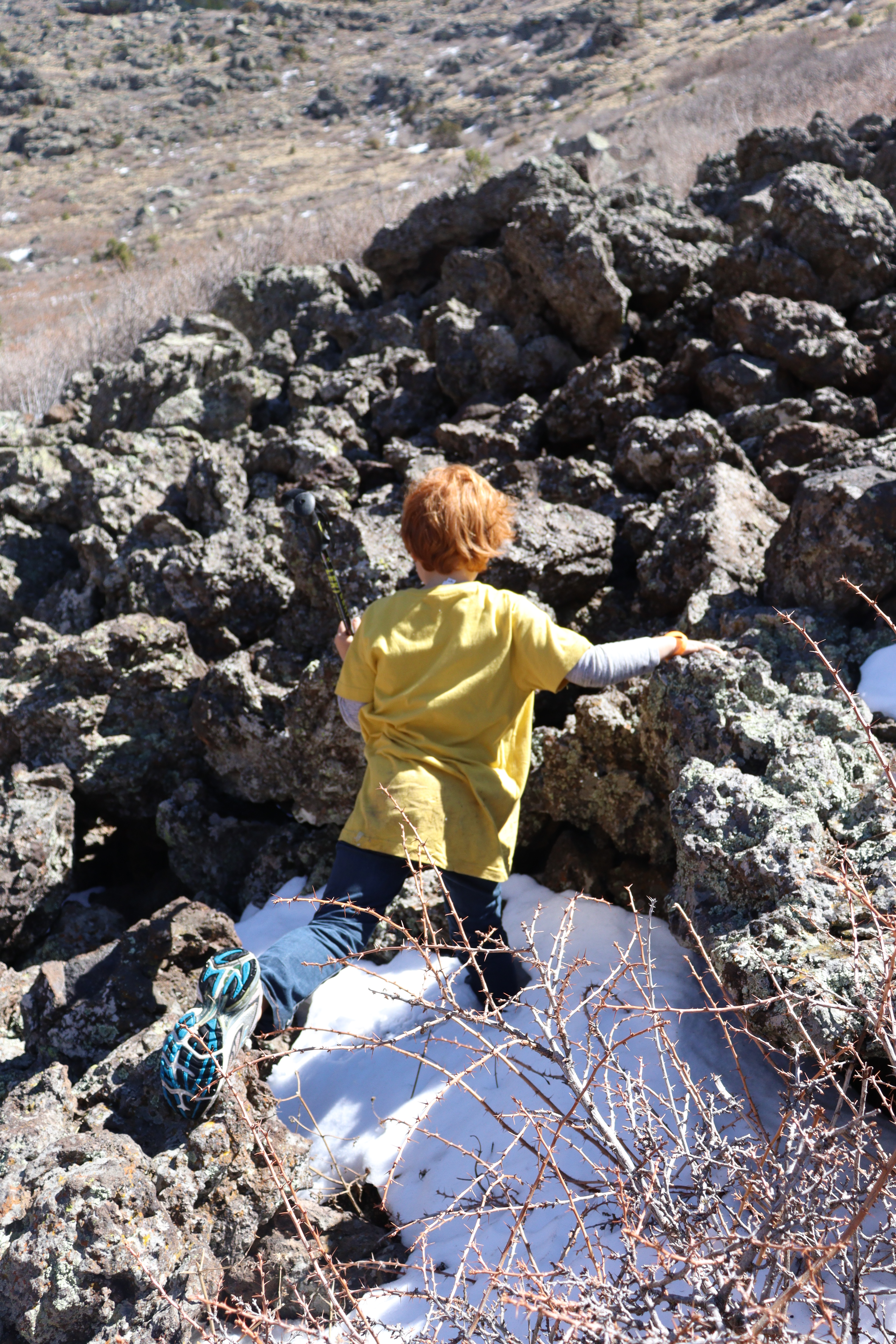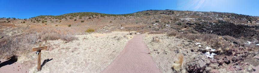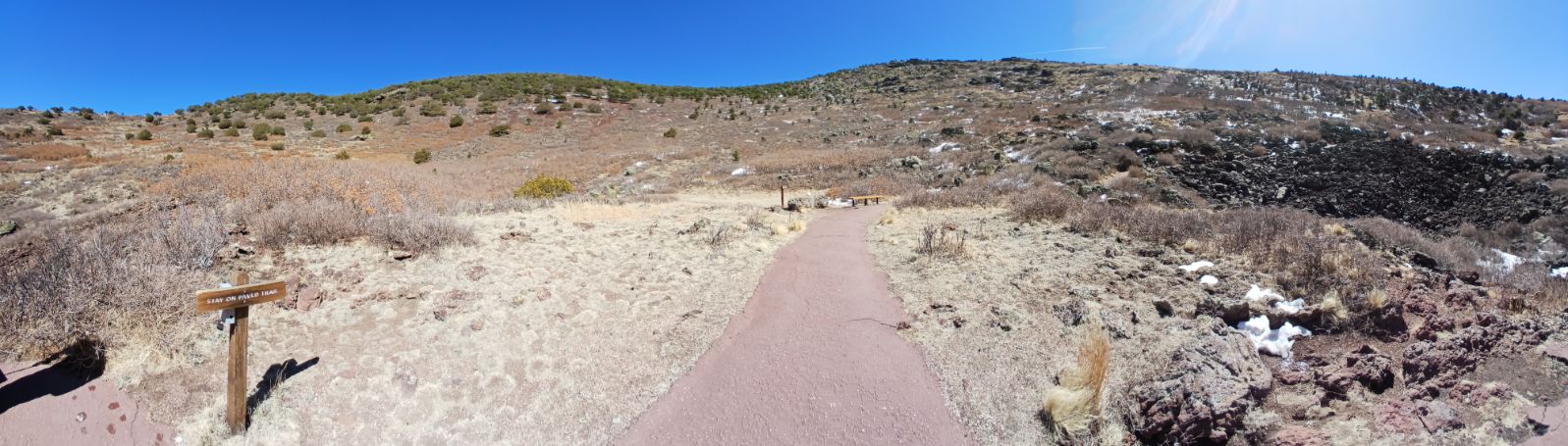 It is a short drive up to the parking lot at the top of the volcano; once at the top, there are beautiful views and several information boards with more information about the volcano. Then, you can start down the trail into this extinct volcano. I consider this relatively short paved trail easy/moderate hiking. When we went, there was some snow cover that made a few spots icy. There is hardened lava rock all along the trail, and my children were very excited to think about actually being inside a volcano.