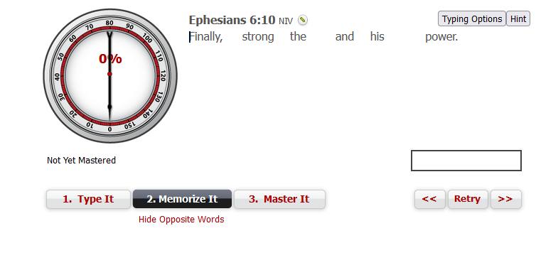 Next, you are given every other word, and you have to fill in the blanks. Finally, you have a blank screen, and you have to type the complete verse (or the first letters of each word).