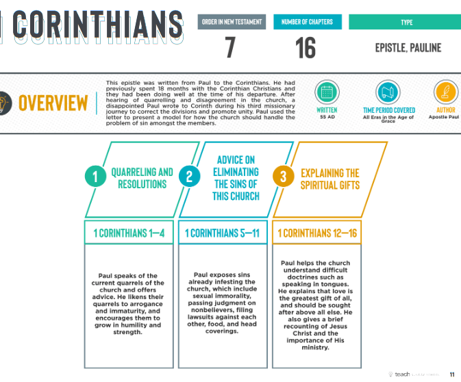 Below that information is a guideline or blueprint of what is in the book, which breaks it down into more significant information sections. For example, 1 Corinthians is divided into three sections: Quarrelling and Resolutions, Advice on Eliminating the Sins of the Church, and Explaining the Spiritual Gifts. The author then goes on to give an explanation and overview under each of those headings.