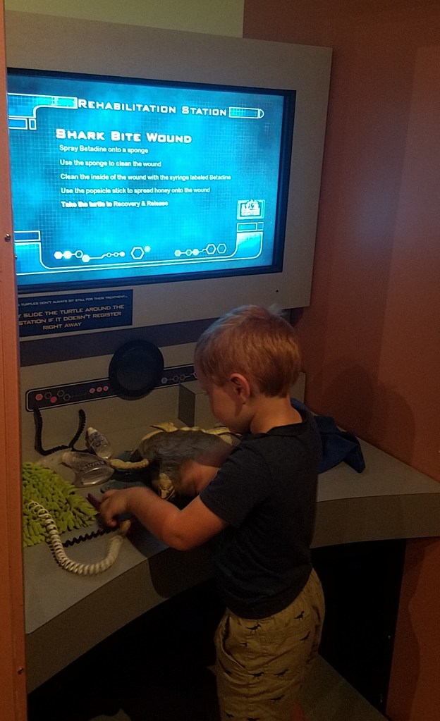 Then a few weeks ago, we went to one of the three semi-local aquariums. In addition to the typical aquarium features, this aquarium has a turtle rehabilitation center. That was the perfect timing to go along with the lesson on aquatic herps.  After seeing the real turtles, my son was able to go through a simulation where he pretended to render vet care to a plastic turtle. If you do not have a beach or aquarium near you, you could go to a local pet store or even a seafood market to get a close-up view of some of the many creatures discussed in this curriculum. In addition, many aquariums and wildlife centers have online resources, virtual field trips, and even live feeds that you can use to get a good view.